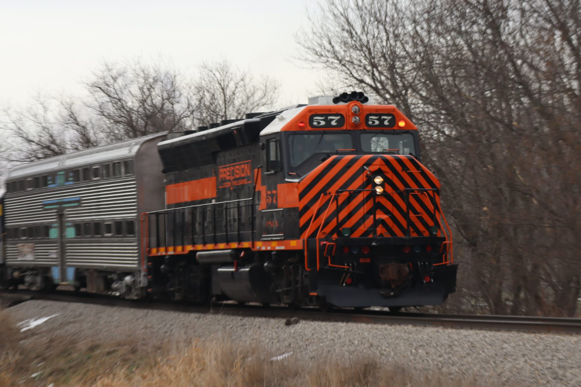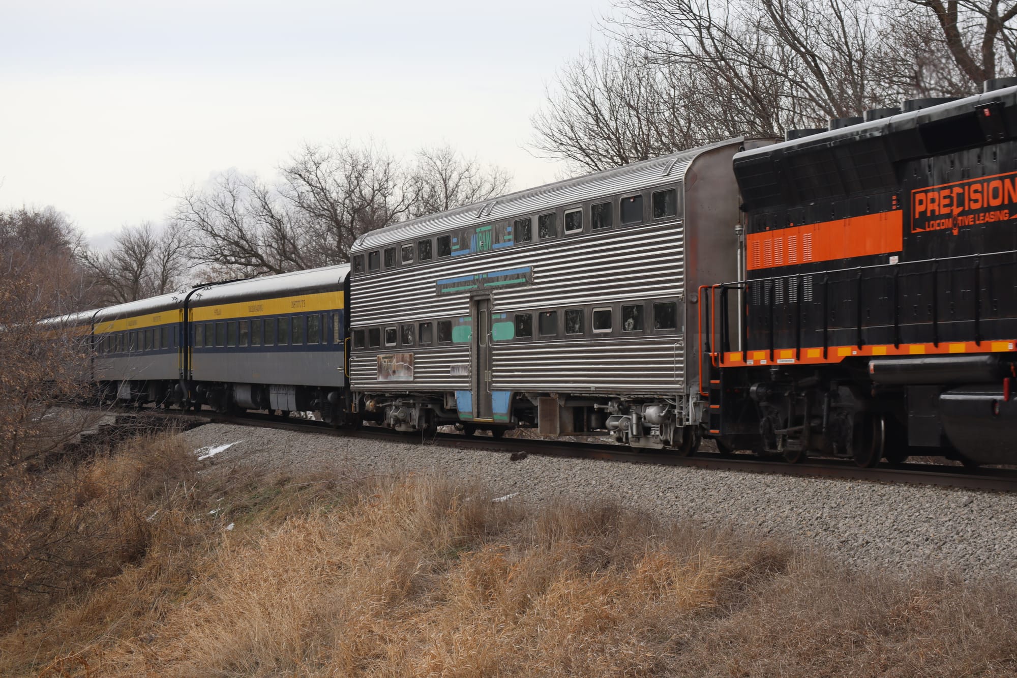 More shots of 1225's consist, including an ex-Metra gallery car (more on that later), and the trailing diesel locomotive they use to run in the other direction, since there are no turning facilities in Ashley (the train's western terminus