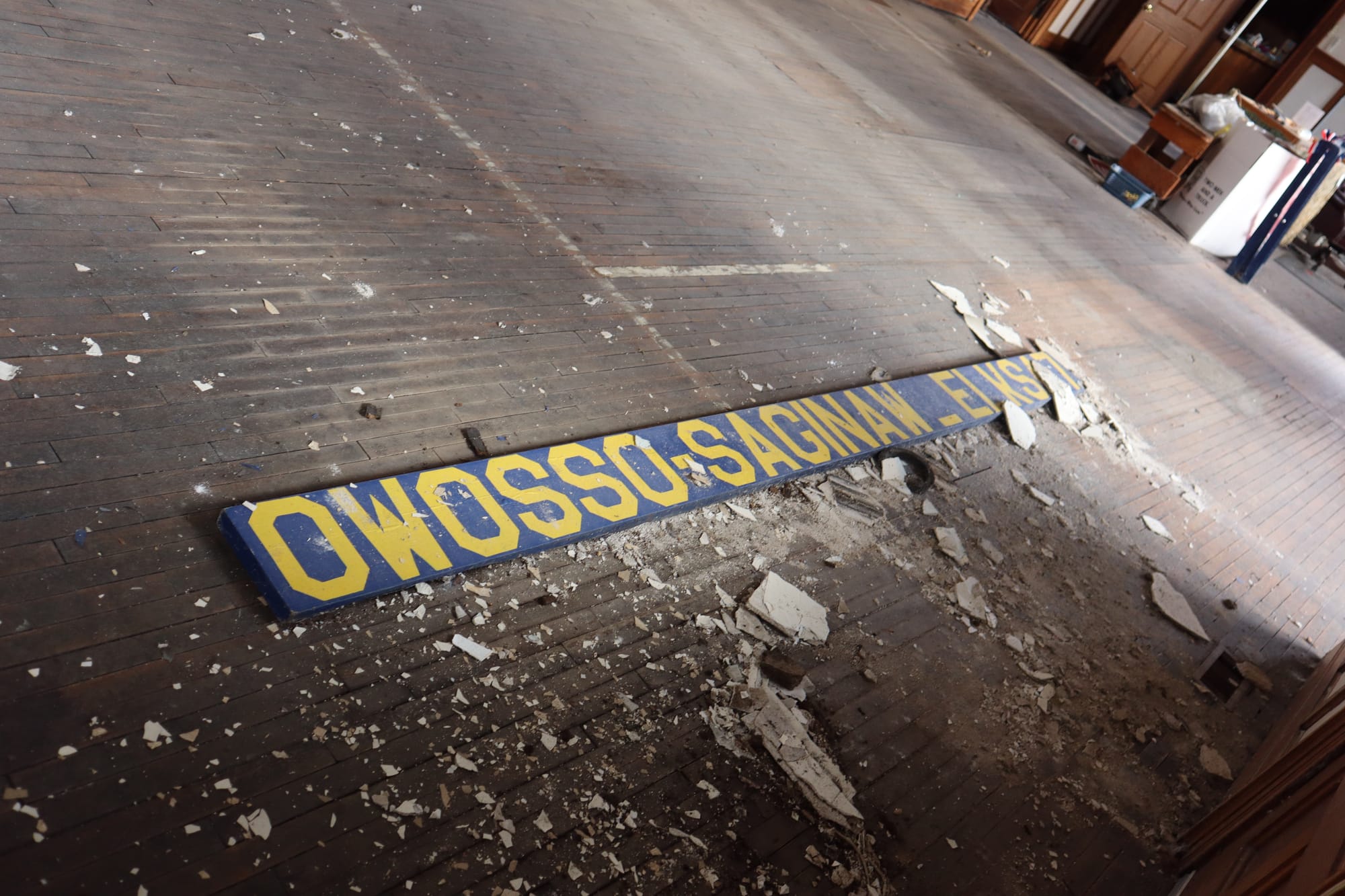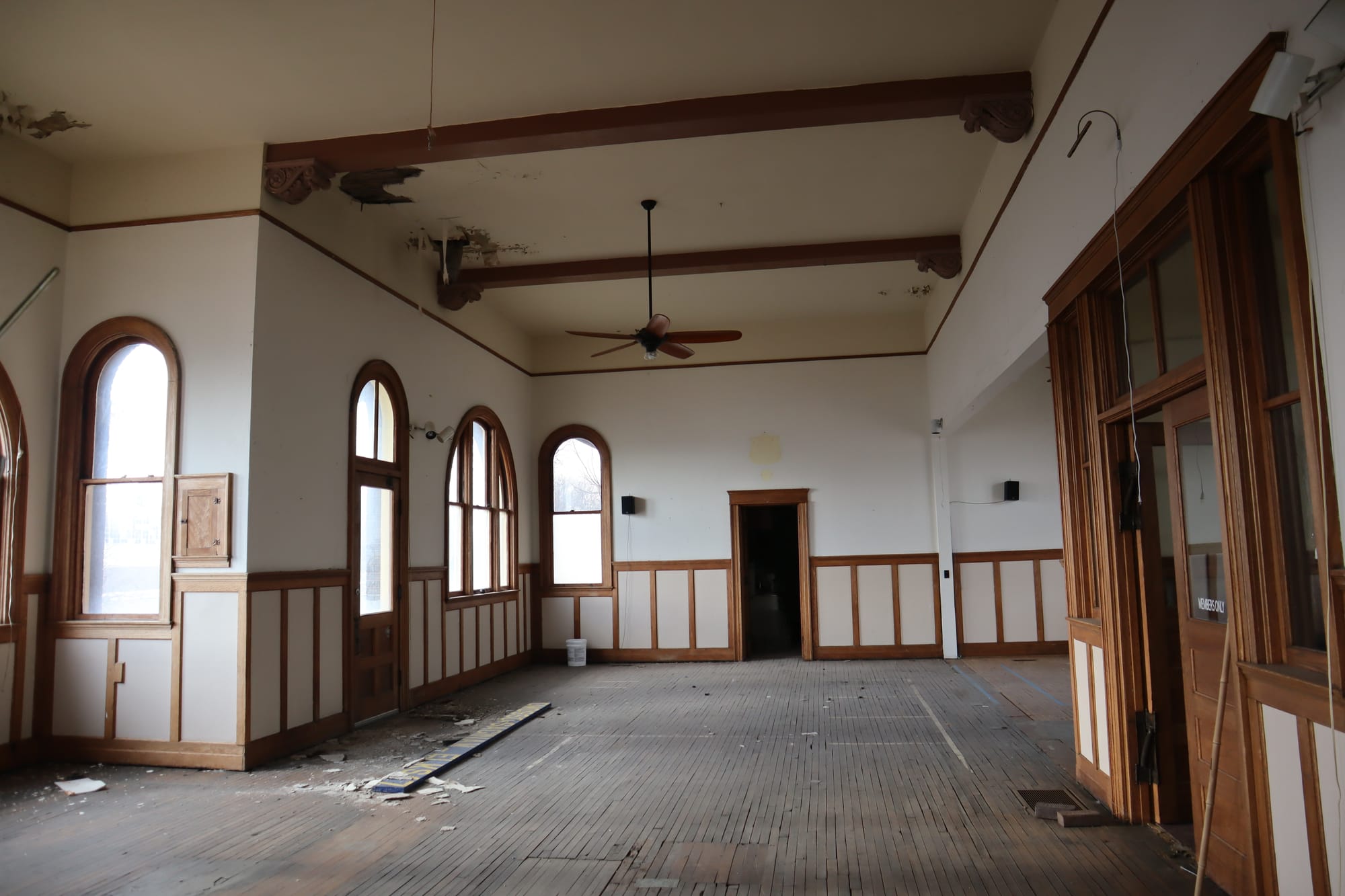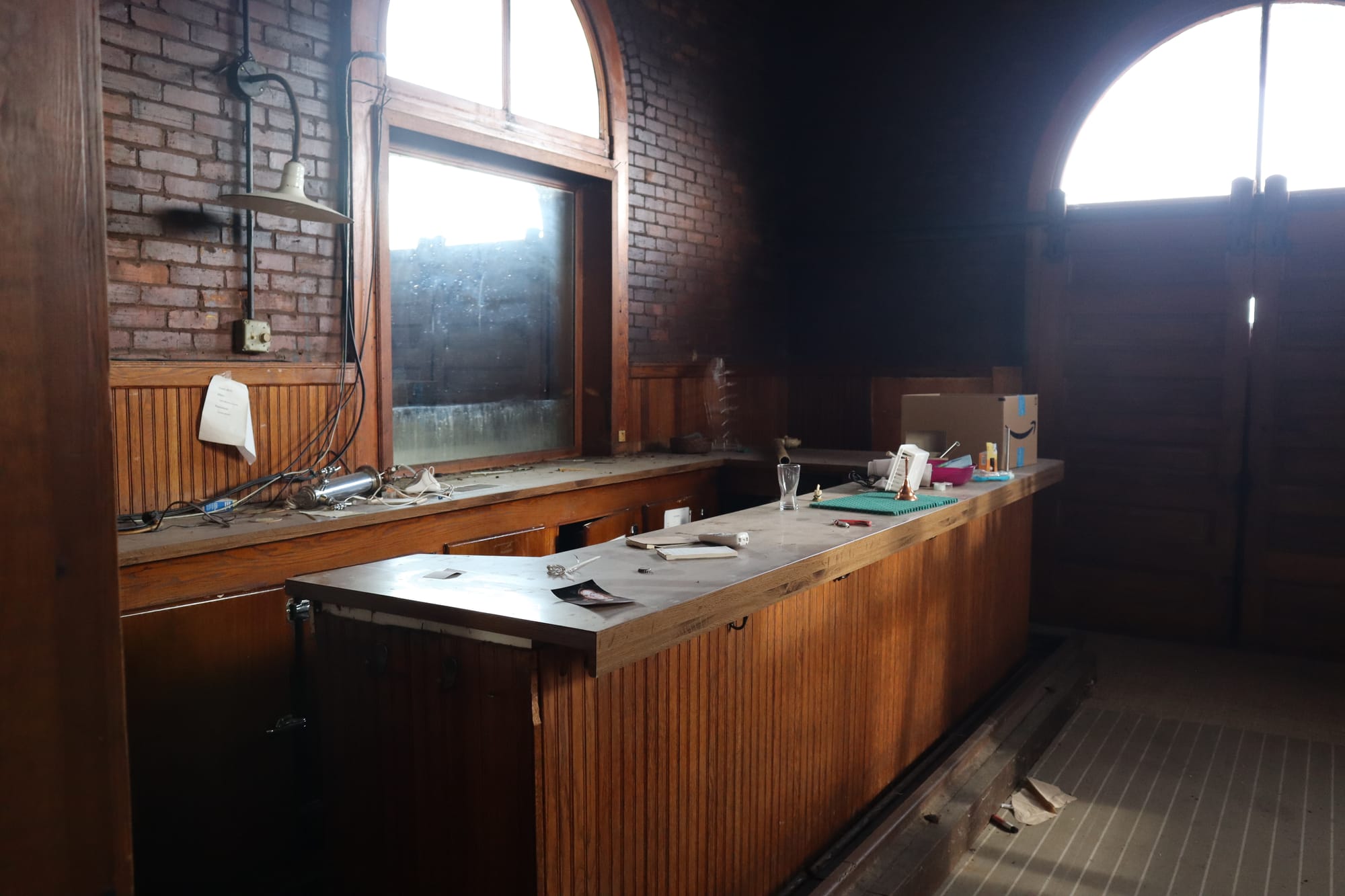 After the chase, we headed back to Owosso (stopping at the Happy Hour Bar & Grill in Bannister, MI, a super charming smalltown haunt) to check out the town while waiting for the train to return from Owosso. We parked again at the old depot, and gave it a closer look. However, on this closer inspection, we noticed a door was ajar. We cautiously entered, and discovered this building was last used as an Elks Lodge. From some sleuthing online, it seems as though this lodge was last active in 2019; like many things, it appears COVID killed them.