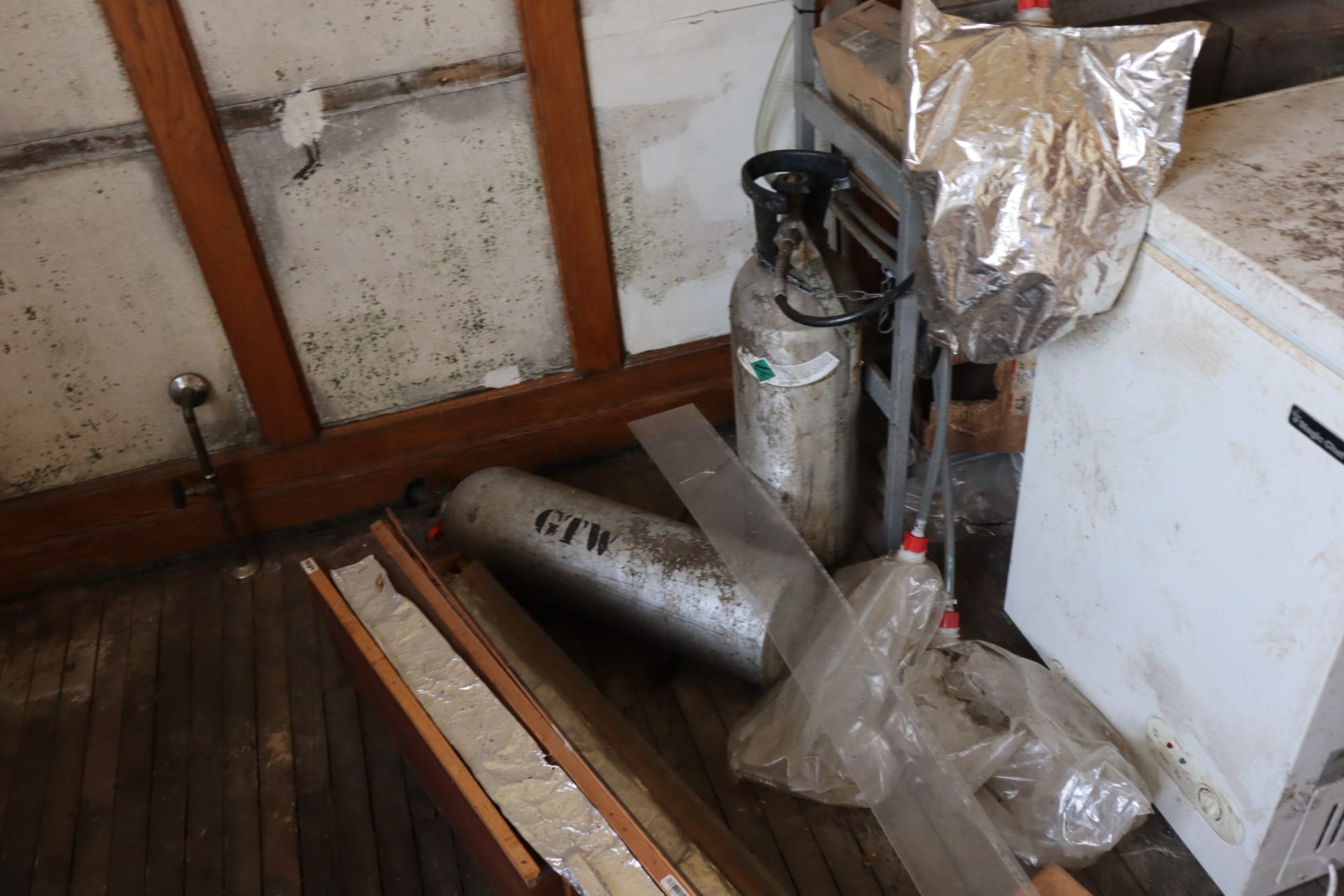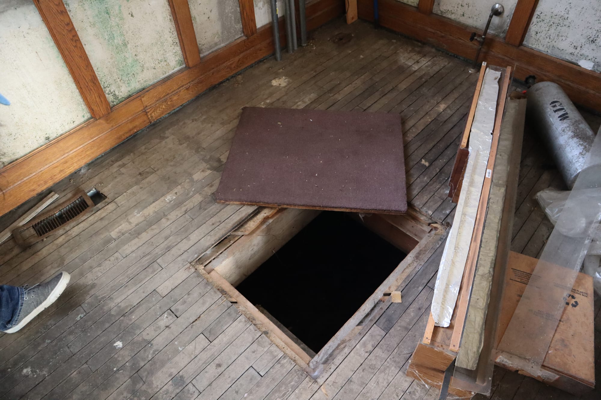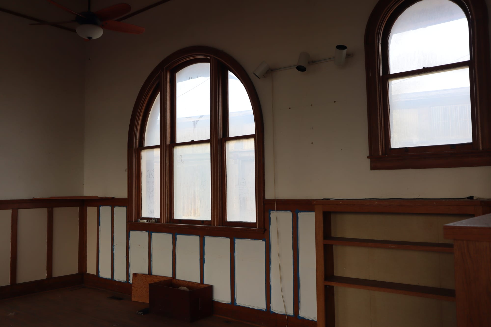 After the chase, we headed back to Owosso (stopping at the Happy Hour Bar & Grill in Bannister, MI, a super charming smalltown haunt) to check out the town while waiting for the train to return from Owosso. We parked again at the old depot, and gave it a closer look. However, on this closer inspection, we noticed a door was ajar. We cautiously entered, and discovered this building was last used as an Elks Lodge. From some sleuthing online, it seems as though this lodge was last active in 2019; like many things, it appears COVID killed them.