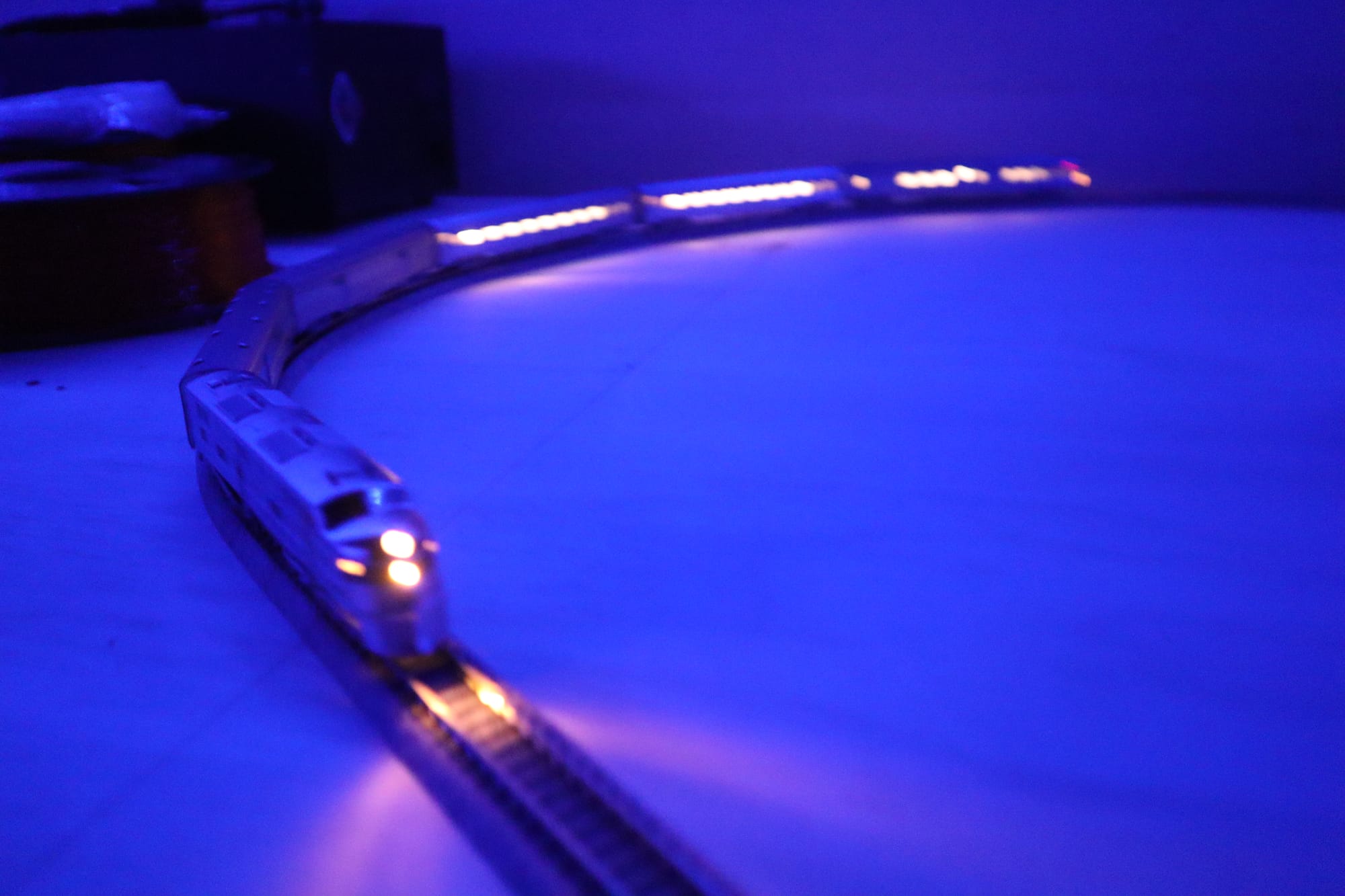 With that being said, please enjoy some shots of my trains running in my basement under some blue lighting, courtesy of the LED strips my roommates put up for parties. Really sells the nighttime effect.