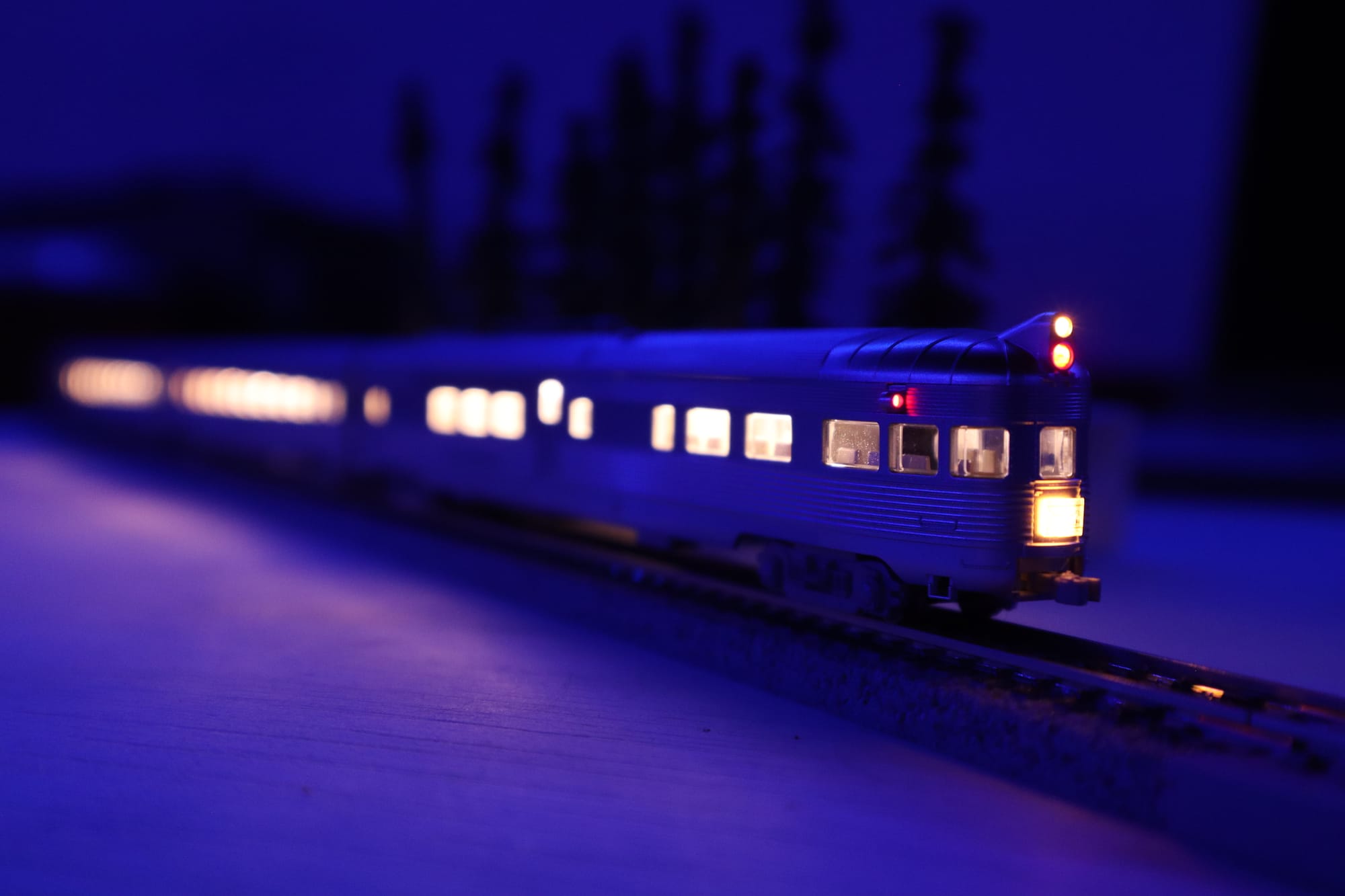 Hey. It's the middle of the night. What am I doing awake? Appreciating some upgrades I made to the tiny trains I have. Why do I need to do this at night? Because I added lighting to my passenger cars.